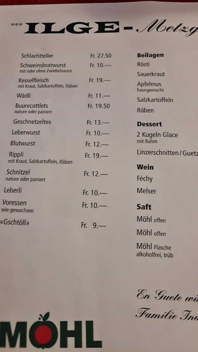 The menu at Ilge Teufen reflects a clear commitment to hearty Swiss cuisine, with a strong focus on meat dishes prepared on the traditional hot stone, complemented by classic regional sides and lighter options. Signature hot-stone plates such as Fleisch Vom Heissen Stein Mit Pommes Und 10 Verschiedenem Frischen Gemüse, Pferdefilet 300gr Vom Heissen Stein Mit Gemüseplatte Und Pommes Frites, Pferdestake Vom Heissen Stein 200g, Lammfilet 200gr Vom Heissen Stein Mit Salatbouqett, and Lammkottlet Auf Heissen Stein stand out for their interactive dining experience, allowing guests to cook premium cuts to their preferred doneness while enjoying generous accompaniments.