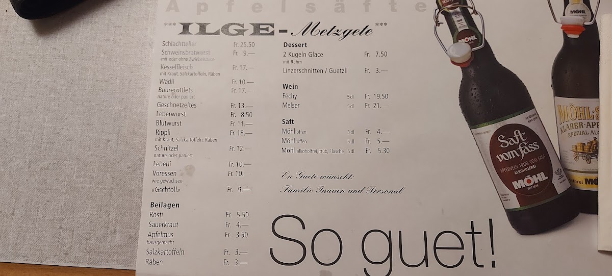 Game dishes play an important role in the menu, with seasonal highlights like Rehrücken Mit Beilagen, Rehrücken Mit Herbstbeilagen, and Rehschnitzel Mit Spätzle Und Rotkraut, which showcase traditional flavors and careful preparation. Classic Swiss comfort food is also well represented through dishes such as Geschnetzeltes Mit Rösti, Cordon Bleu Vom Kalb Mit Gemüse, Wädli Blutwurst Und Sauerkraut, and Appenzeller Südwurst With Salad Fitnessteller, offering familiar tastes that appeal to a broad range of diners.